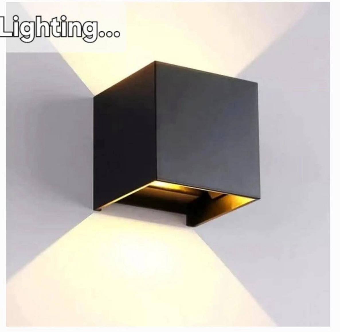أباليك حائط بتصميم مكعب مع إضاءة LED لأعلى ولأسفل تعطي شكلاً عصريًا وأنيقًا. هيكل من الألمنيوم باللون الأسود المطفي وضوء دافئ مريح—مناسب لغرف النوم والممرات والسلالم وغرف المعيشة. تركيب جداري داخلي