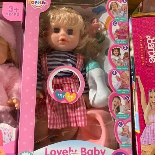 A sweet baby doll with blonde hair, pink outfit, and feeding accessories—perfect for pretend play and nurturing activities for young children.