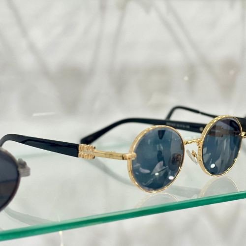 Timeless round sunglasses with a slim gold metal frame, deep blue lenses, and black temples. Lightweight, unisex, and perfect for everyday style. UV400 protection.