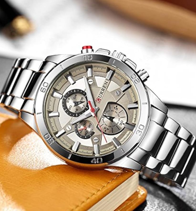 Elegant Curren men’s chronograph watch with a full silver stainless steel case and bracelet and a stylish beige dial. Features three functional sub-dials for chronograph timing, a red second hand for sporty contrast, and raised metallic hour markers for easy reading. Quartz movement ensures accurate timekeeping, while the polished bracelet and bold bezel make it perfect for both business wear and smart casual outfits.