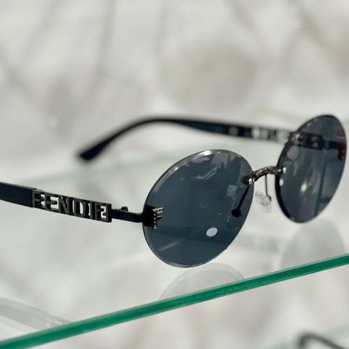 Minimal round, rimless lenses with a slim metal bridge and bold FENDI logo temples. Lightweight fit and UV400 protection for everyday style.