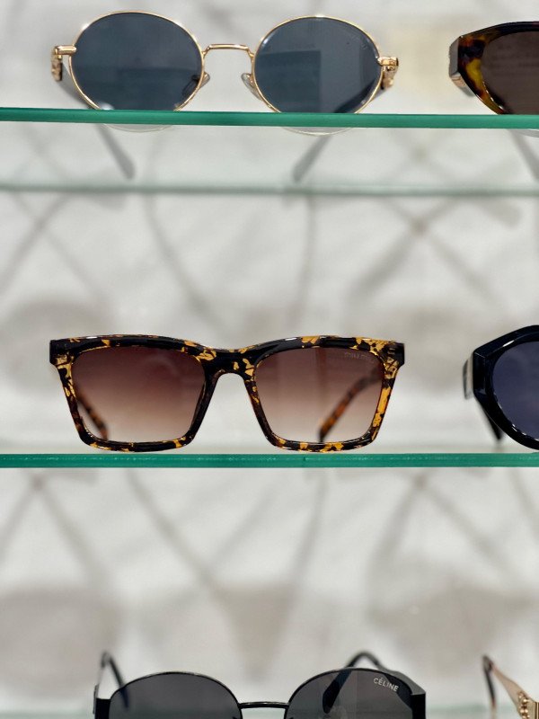 AR: نظارات شمسية عصرية بإطار مربّع لامع بنقشة السلحفاة وعدسات بنية متدرّجة. خفيفة ومريحة مع حماية كاملة UV400—مثالية للاستخدام اليومي.