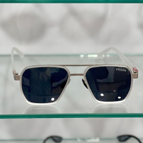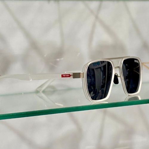 نظارات شمسية أنيقة من برادا بتصميم مربّع وإطار أبيض وعدسات داكنة، تمنحك مظهراً عصرياً راقياً مع حماية عالية من أشعة الشمس.