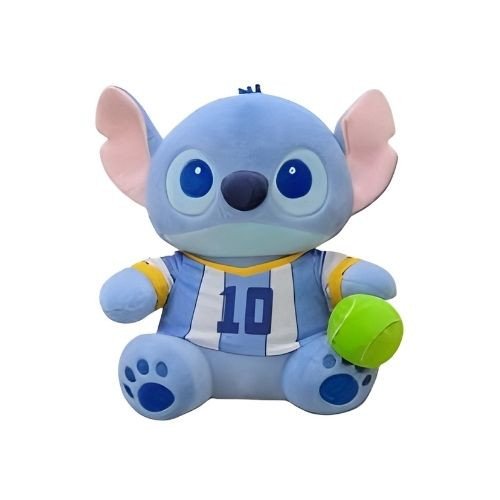 Soft and cuddly Stitch plush toy wearing a sports jersey. Perfect for kids and fans of the beloved Disney character. Bright colors and adorable design make it a great gift or collectible.