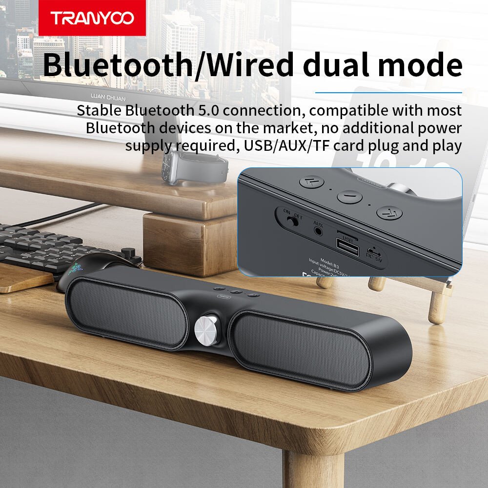 Enjoy powerful, clear sound anywhere with the Tranyoo T-B3 Bluetooth Speaker. Designed with modern style and advanced dual-mode technology, it supports both Bluetooth 5.0 and wired connections, giving you the flexibility to connect however you like — anytime, anywhere.